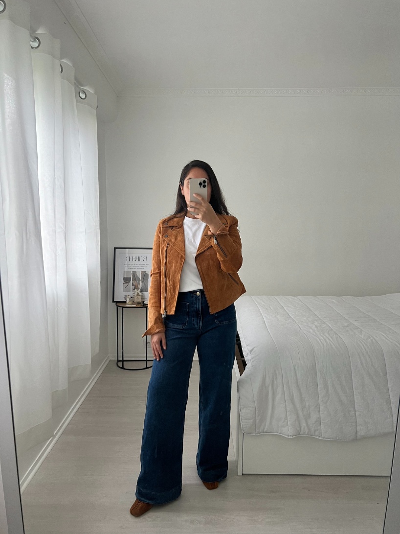 Confectionnée dans un daim de haute qualité, elle offre une texture douce et résistante. Les détails classiques, tels que les zips asymétriques et les poches latérales, ajoutent du caractère tout en étant pratiques. La coupe ajustée met en valeur la silhouette, idéale pour un style à la fois féminin et rebelle.